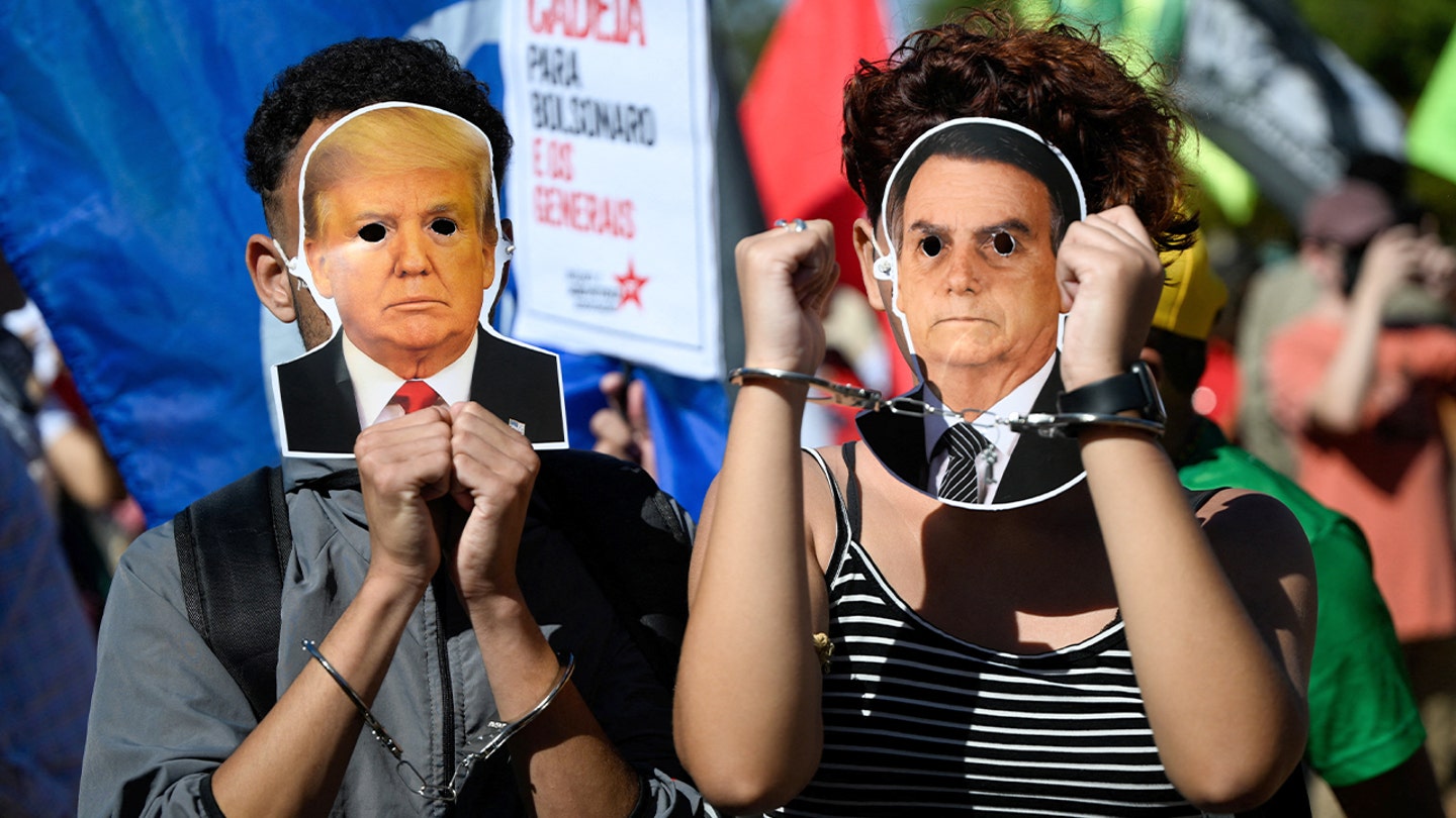 Protesters, who put on masks of President Donald Trump and former Brazilian President Jair Bolsonaro, gesture in handcuffs throughout a protest towards Trump’s charges on Brazilian merchandise, for the American embassy in Brasilia, Brazil, August 1, 2025. (Reuters/Mateus Bonomi)