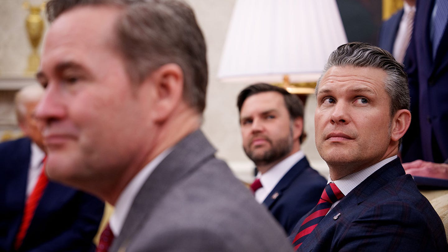 Protection Secretary Pete Hegseeth listens to a query from a reporter throughout a gathering within the Oval Workplace of the White Home on March 13, 2025. (Andrew Harnik/Getty photos)