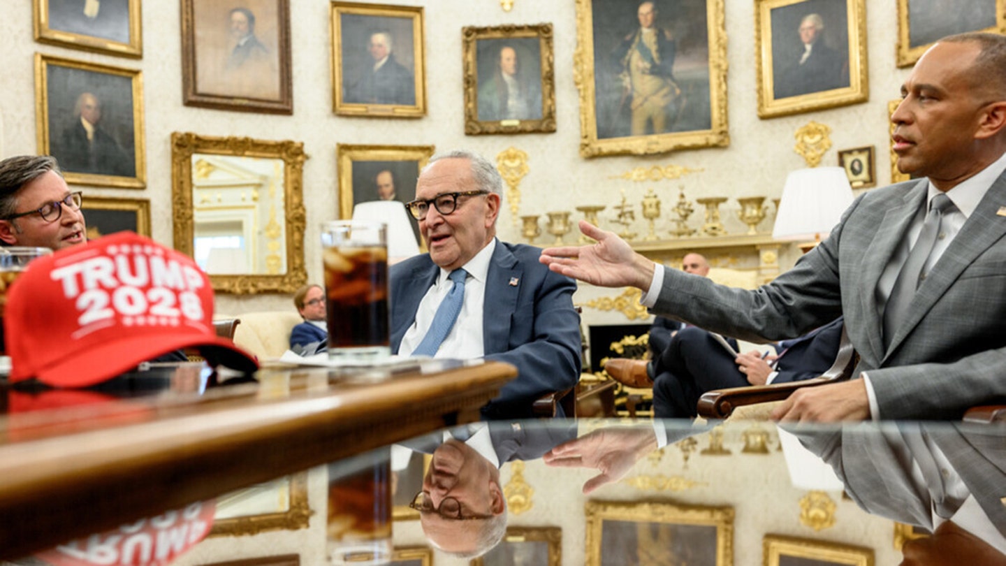 A “Trump 2028” hat might be seen within the foreground on the Oval Workplace, as a home speaker Mike Johnson, R -La., Left, Senate minority chief Chuck Schumer, DN.Y., and home removing chief Hakeem Jeffries, Dn.y., met on Monday to a doable authorities to be a authorities -ending. (@realdonaldtrump through Reality Social)