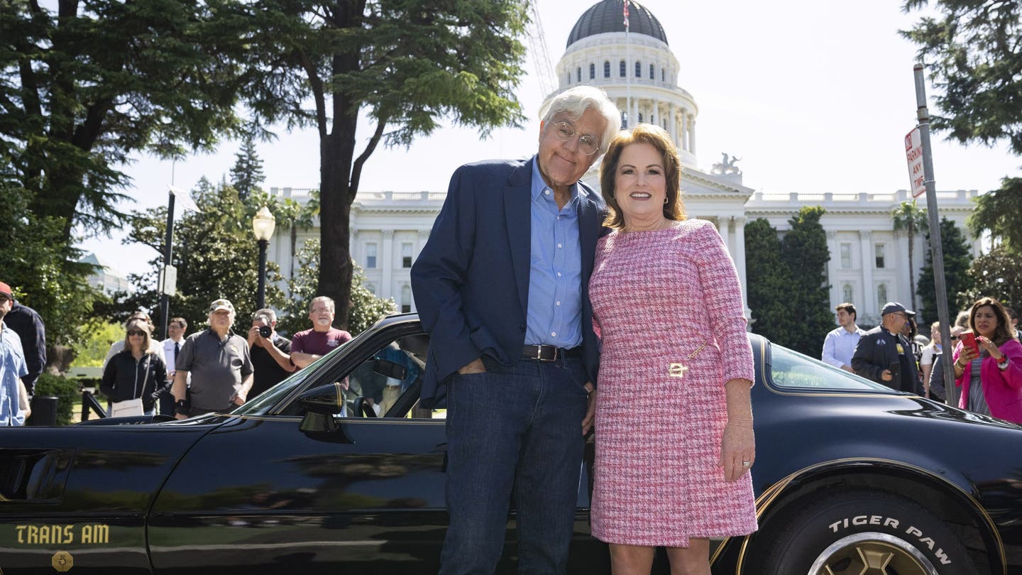 California Republican State Senator Shannon Grove and Jay Leno sail across the California State Capitol in a Pontiac Trans AM of 1976 on April 8, 2025. (California State Senate)