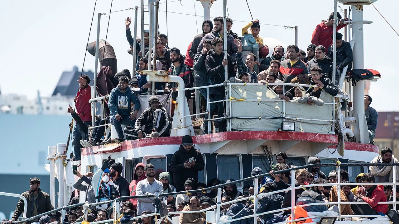 Migrants aboard a fishing boat arrive on the port of Catania in Italy in 2023. (Fabrizio Villa/Getty Photos)