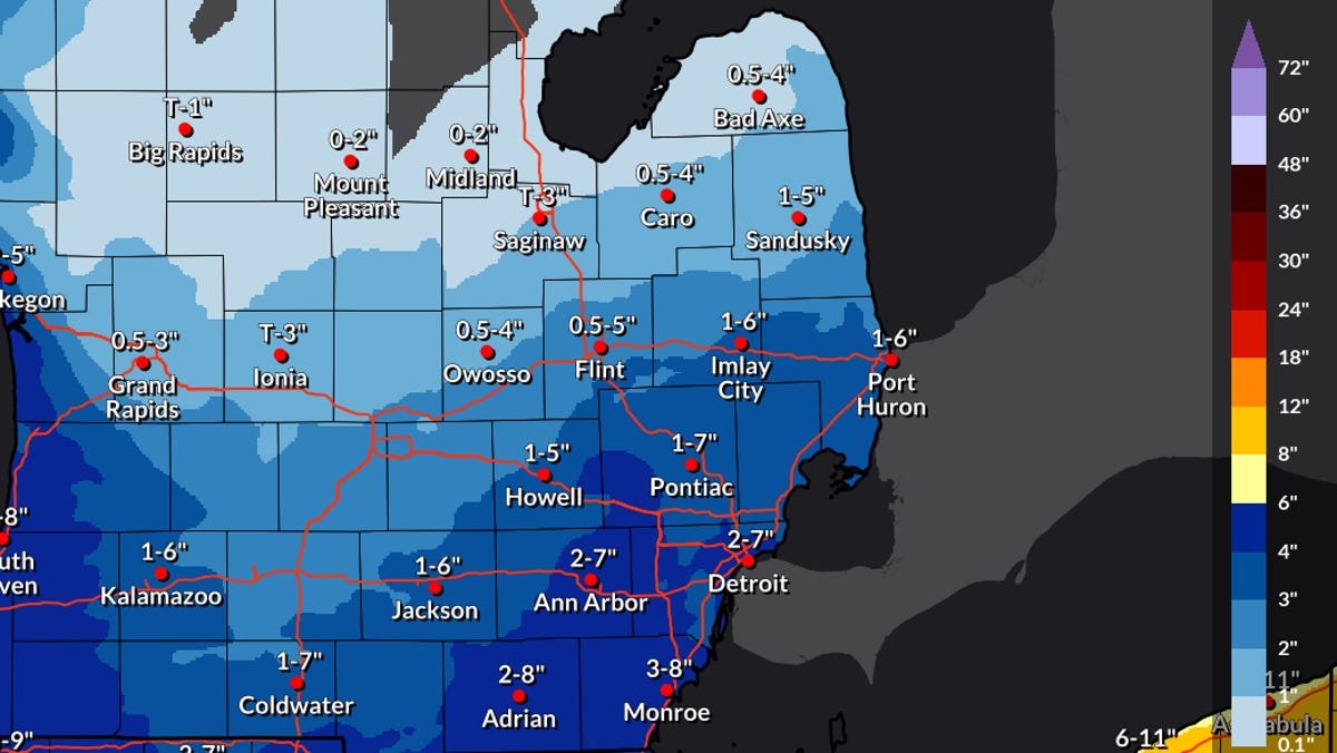 Monroe is predicted to get 3 to eight inches of snow, however might see 1 to 4 inches. Ann Arbor is estimated at 2-7 inches, however can see between 1 and 9 inches.