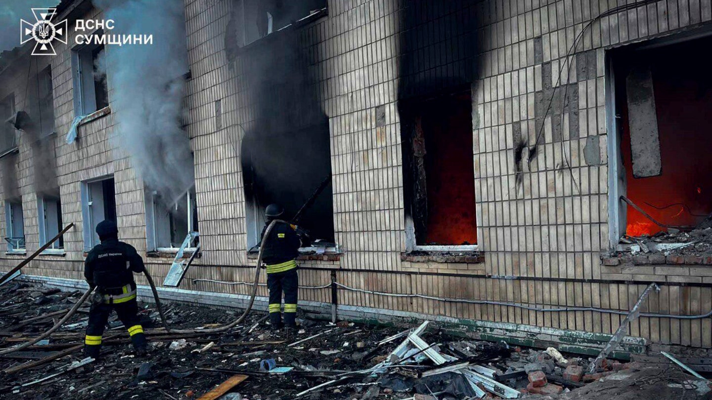 Firefighters reply to a Russian assault in Krasnopillia, within the Sumy area of Ukraine, on Wednesday 19 March. (Ukrainian emergency service by way of AP)
